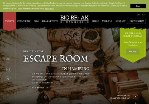 Big Break Hamburg ist ein neuartiges Event namens ?Real-Life Room Escape Game?. Bucht einfach einen freien Termin in unserem Buchungskalender und startet den größten Gefängnisausbruch, den die Stadt jemals gesehen hat. ...